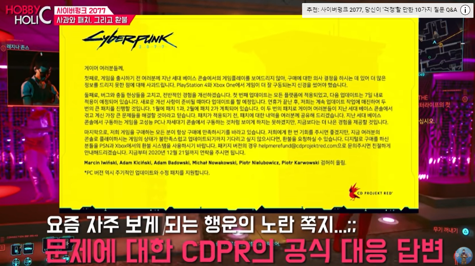 죄송합니다! 사이버펑크 2077 공식 사과와 패치 계획, 그리고 환불 안내