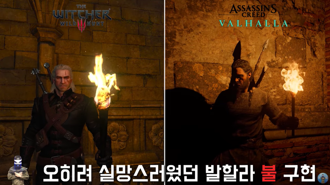 사실 발할라 처음 불꽃 그래픽을 보고 약간 충격을 먹었던게 오히려 조금 퇴보된 듯한 느낌을 받아 아쉬웠던 부분이었습니다. 위쳐 불 그래픽은 실제 불 그래픽 발광효과를 그래픽으로 그대로 옮겨온 느낌이고 발할라의 불 그래픽은 일반적으로 많이 볼 수 형태의 입자 구현이라 개인적 취향에서 봤을땐 위쳐 쪽 불 그래픽이 더 취향에 맞는 것 같네요.