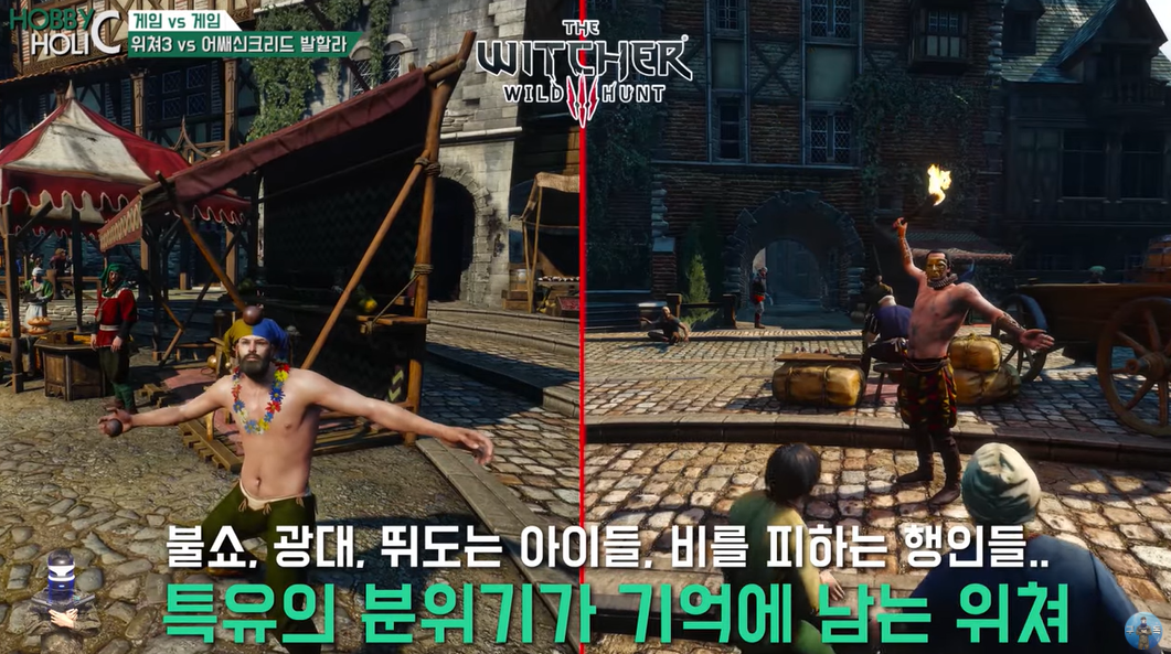 개인적으론 위쳐의 NPC들이 조금 더 기억에 남는게 노비그라드 같은 큰 도시를 갔을때 열심히 음악을 연주하거나 그림을 그리거나 불쇼를 하던 광대들이 생각이 납니다. 그래픽이 좋았다기보단 그 특유의 도시 분위기와 함께 울려퍼지던 BGM 덕분에 더 기억이 나는건지도 모르겠네요.