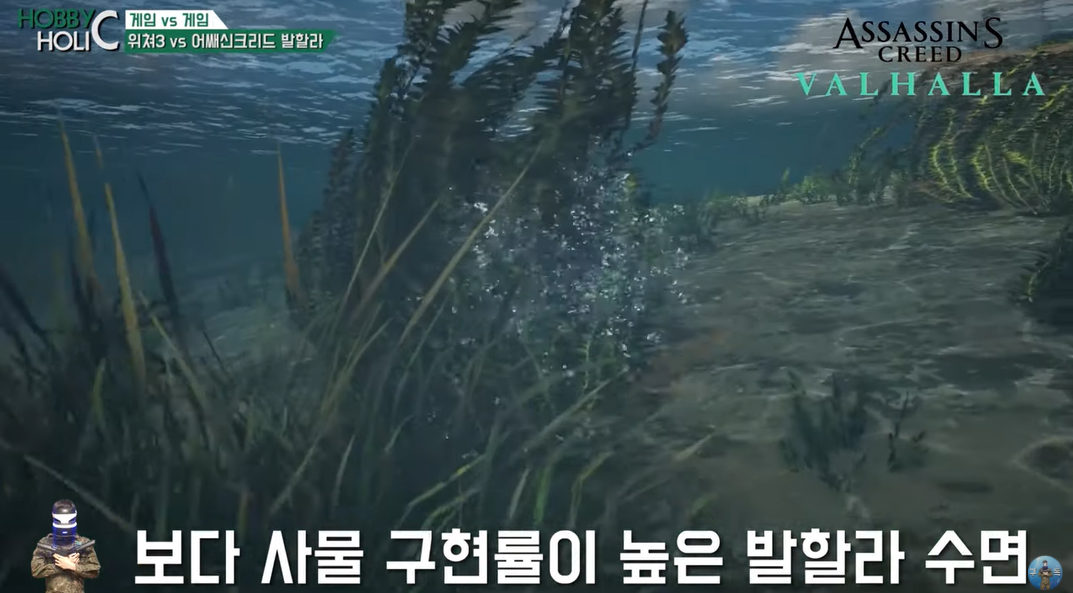 다만 그럼에도 불구하고 수면위로 보여지는 하늘 일렁임이라던지 기본적인 물속 표현을 나타내는 블러효과는 적절하게 반영되어 있어 보입니다. 발할라 물속 그래픽은 전반적으로 위쳐에 비해 사물 구현률이 올라간 걸 볼 수 있습니다.