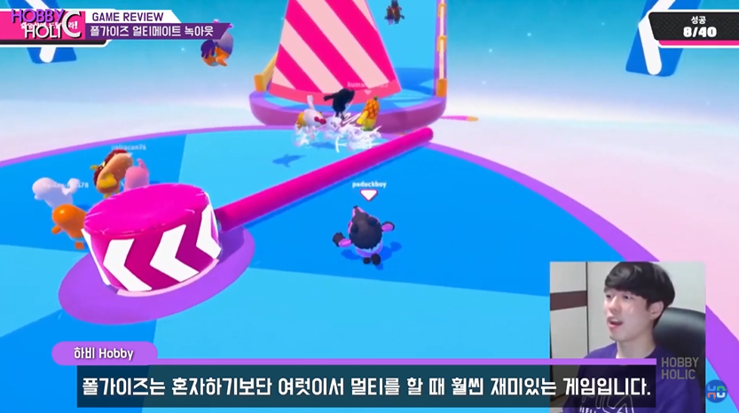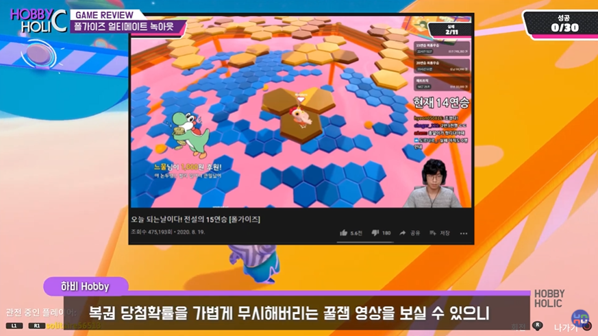 폴가이즈는 폭발적인 인기에 힘입어 한 때 '리그오브레전드'를 제치고 시청률 1위를 달성하기도 했으며 성공의 가장 큰 견인이유로는 유명 스트리머들이 잇따라 '폴가이즈'를 재밌게 플레이하는 방송을 진행하며 고공행진에 더욱 강력한 추진력을 더해줬습니다. 국내 스트리머 중 가장 유명한 영상 중 하나는 '녹두로월드'님의 15연승 영상인데 복권당첨확률을 가볍게 무시해버리는 꿀잼 영상을 보실 수 있으니 고인물 영상이 궁금하시다면 추천드립니다.
